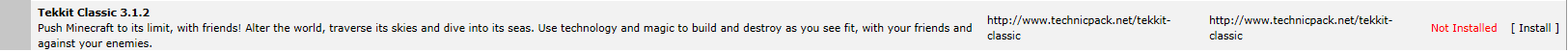 3) Install a mod of your choice by clicking "Install", for example, installing Tekkit Classic 3.1.2 (as of this publishing)